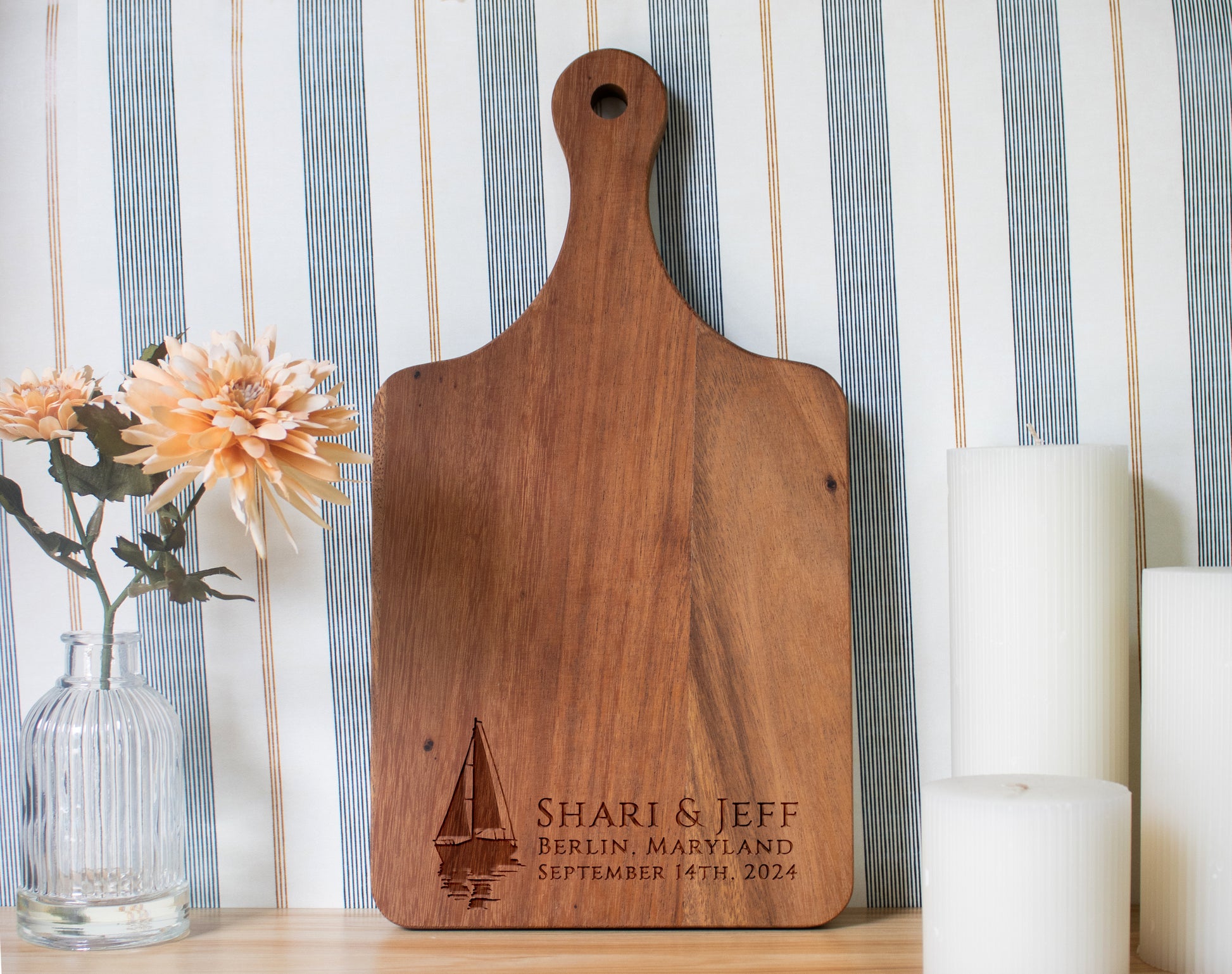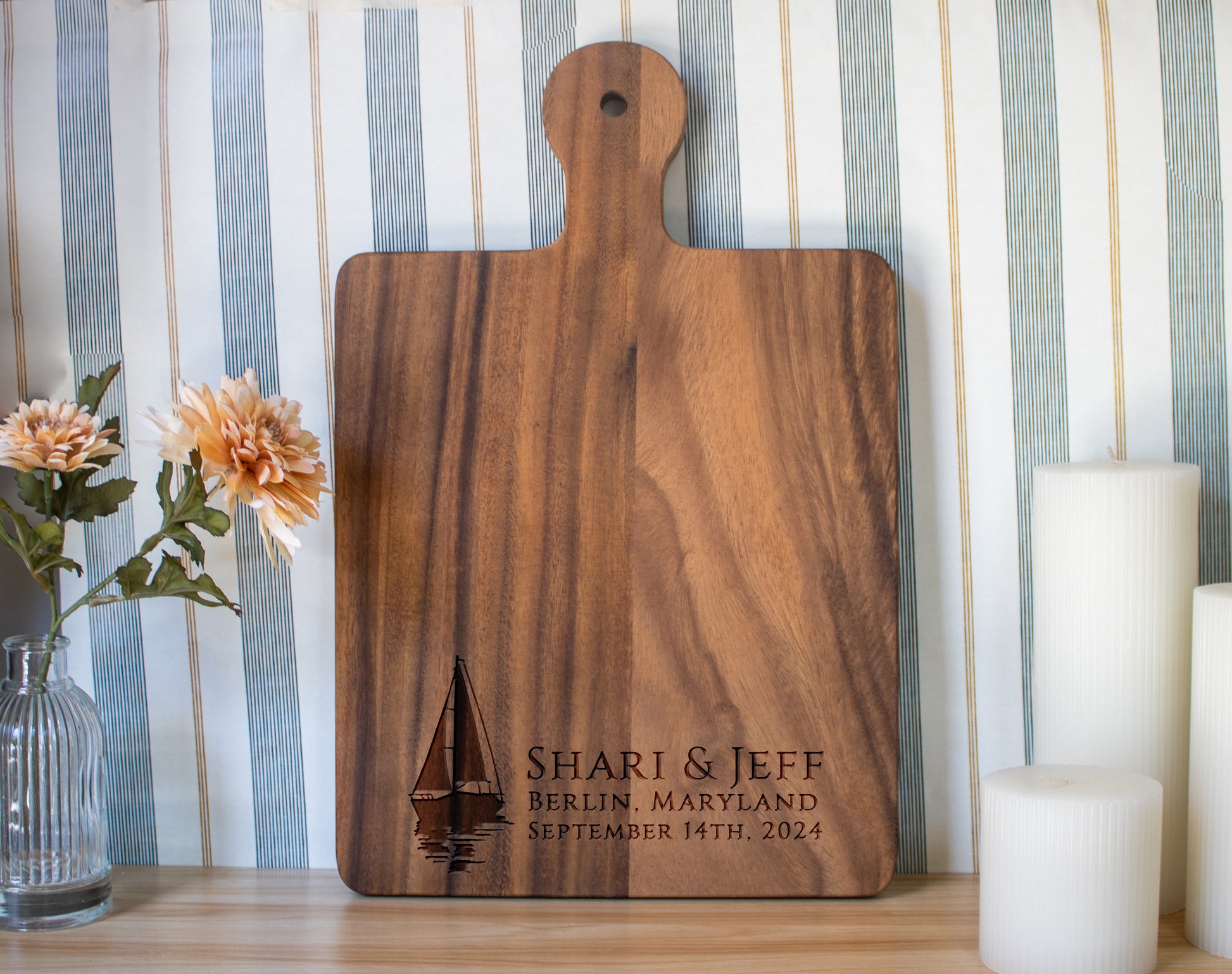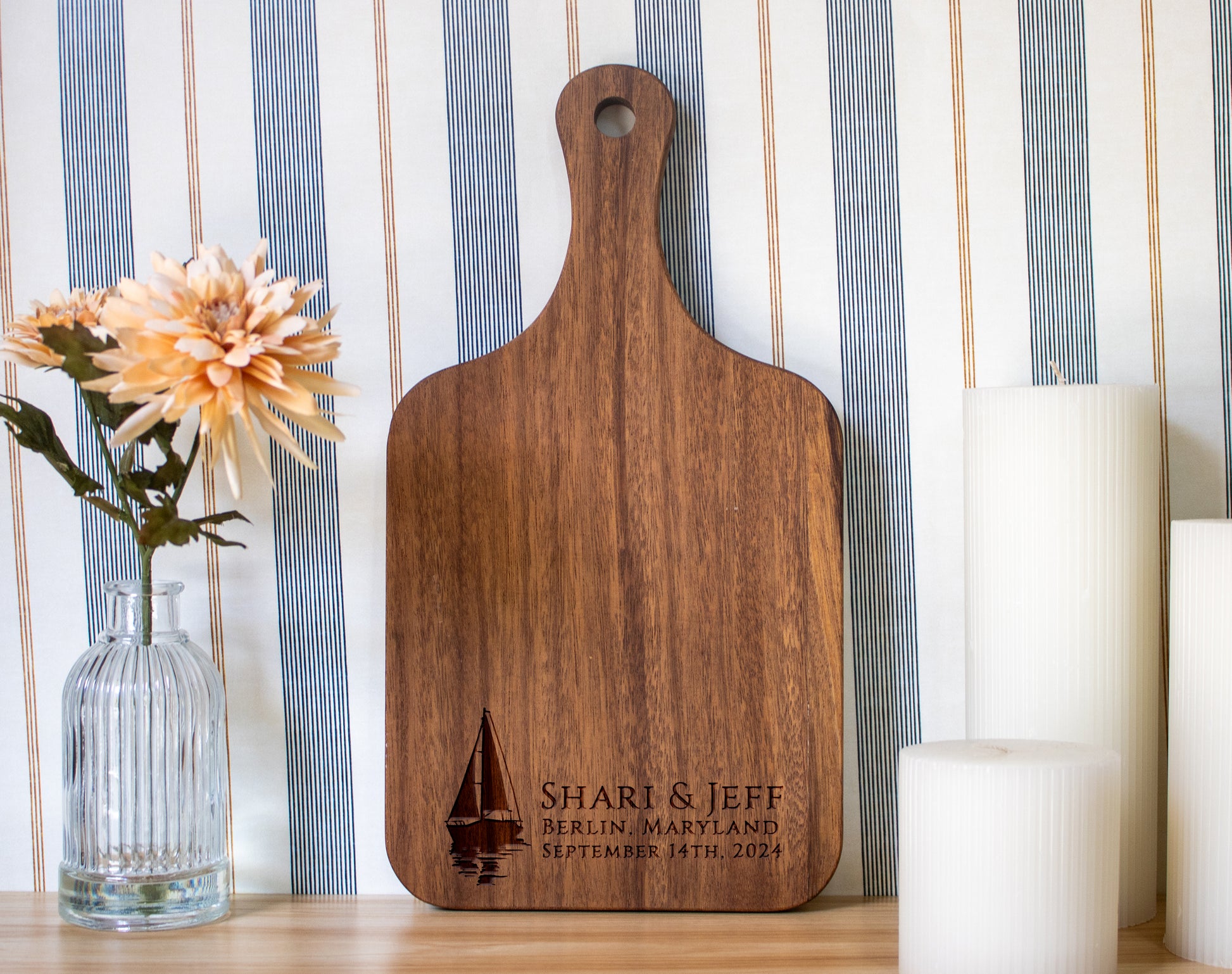 This wooden cutting board is perfect for the sailing enthusiast in your life. It's personalized with a sailboat theme, making it a unique and special gift for a wedding or housewarming. The sturdy construction and beautiful design make it a functional and decorative piece for any kitchen.