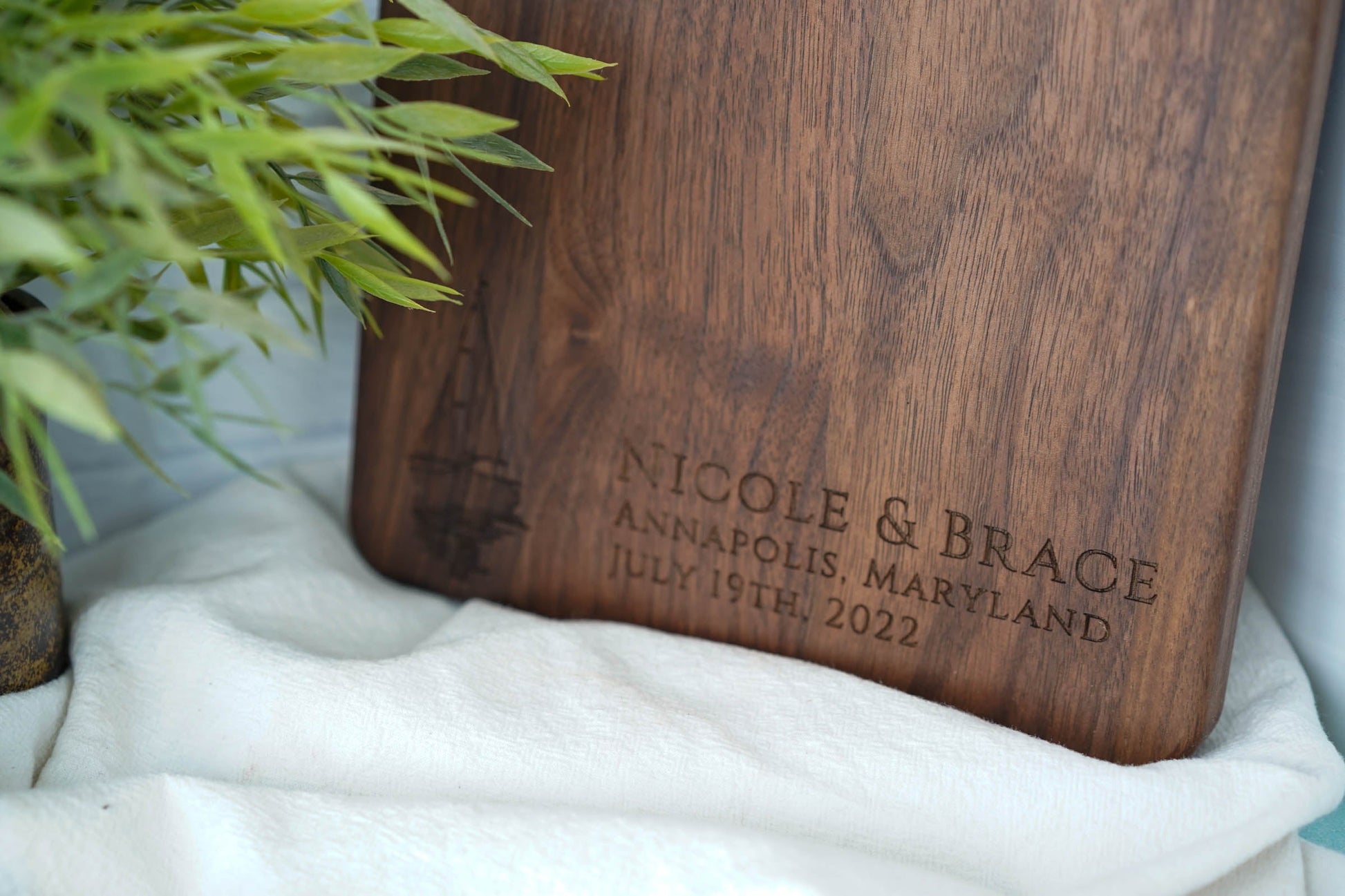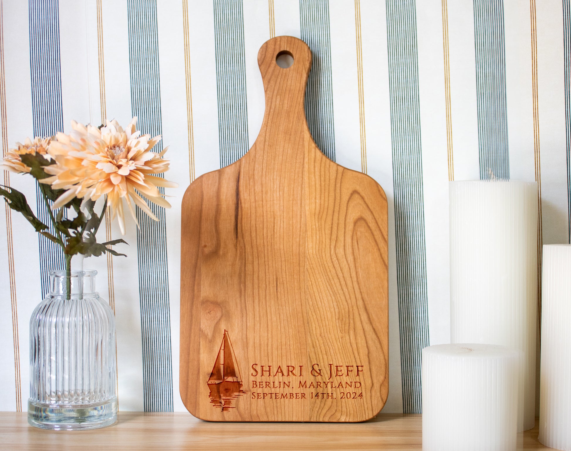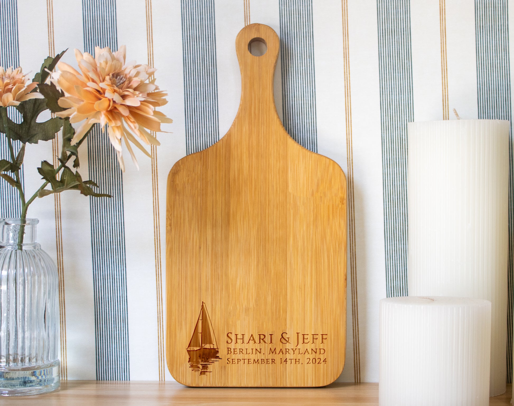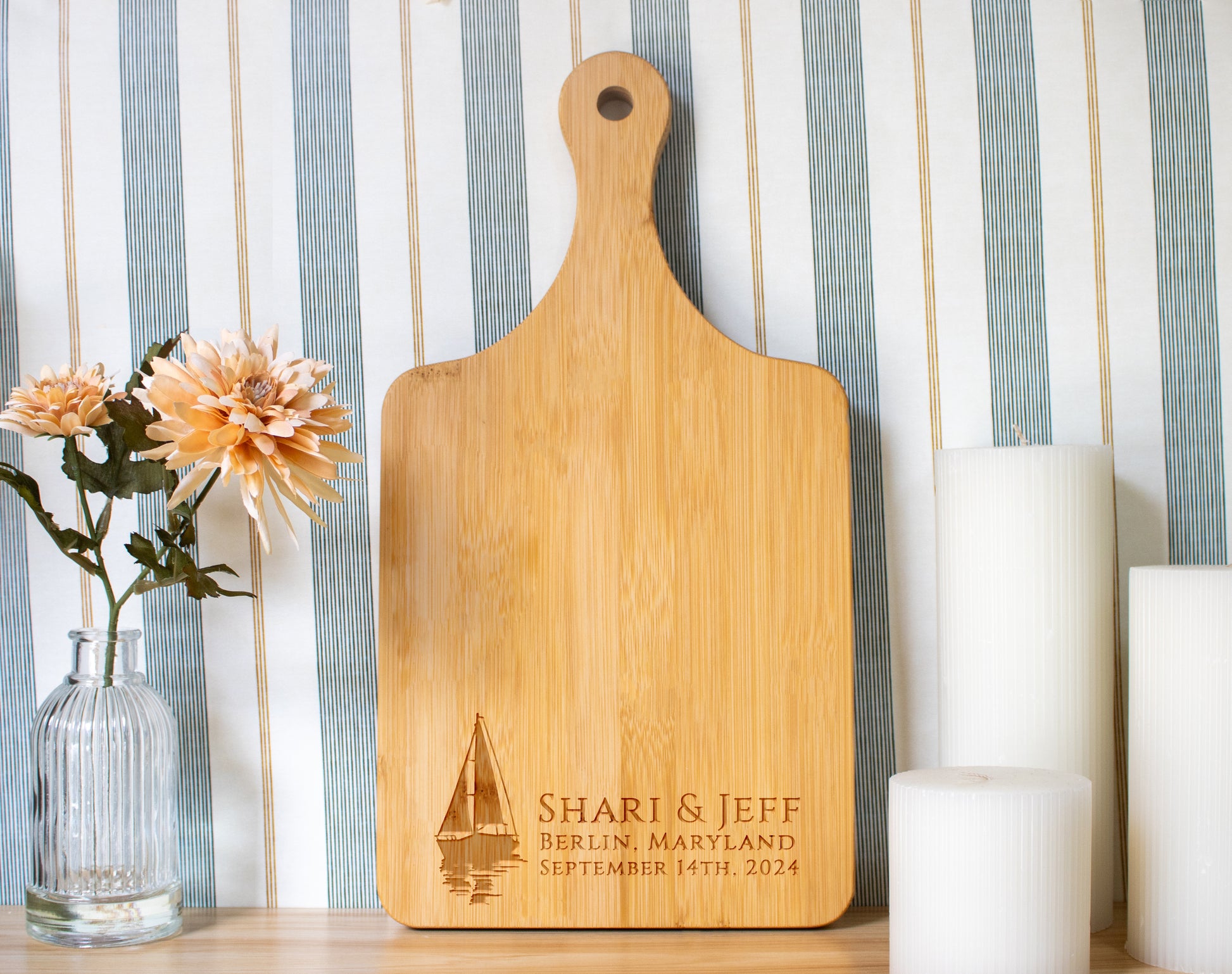 This wooden cutting board is perfect for the sailing enthusiast in your life. It's personalized with a sailboat theme, making it a unique and special gift for a wedding or housewarming. The sturdy construction and beautiful design make it a functional and decorative piece for any kitchen.